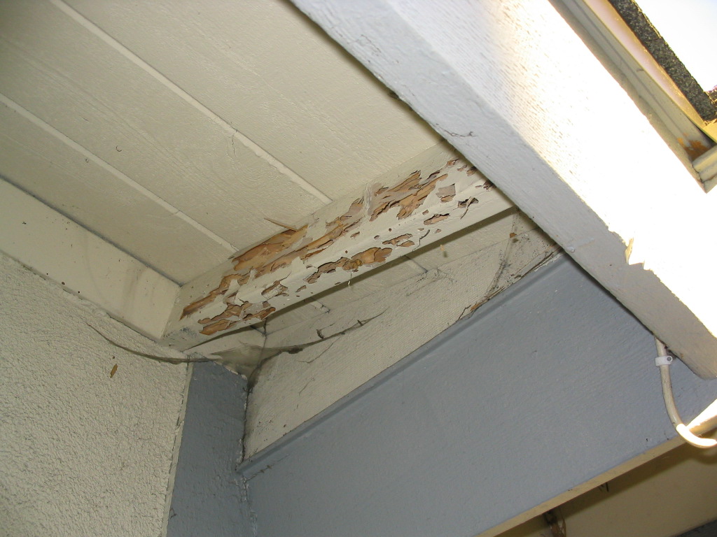 staple penetrates with no resistance; indicating termites have hollowed-out the board (just behind the paint). Infestations can be found on attic